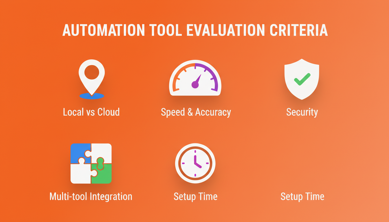 We tested each tool based on criteria that matter for individual knowledge workers and small teams, not enterprise IT departments. The key factors: where the automation runs (local browser vs. cloud servers), which browsers it supports, and how quickly you can start using it without technical setup or API configurations.