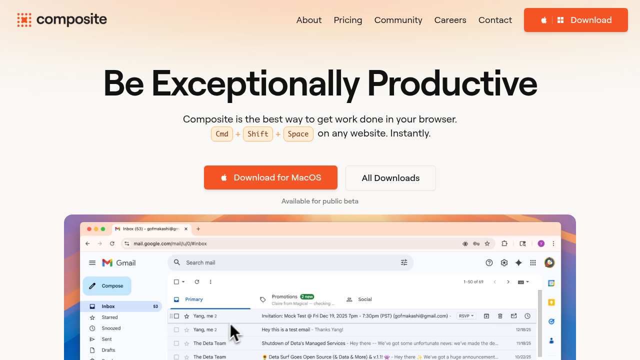 Composite is the proactive AI assistant that works in your existing Chrome, Edge, or Brave browser and learns your workflows to suggest automations before you ask. Press Cmd/Ctrl+Shift+Space on any website, describe a task, and watch it execute multi-step sequences across tabs, forms, and sites using your logged-in sessions.