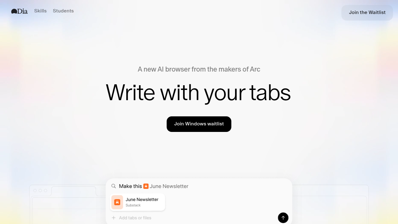Dia provides AI-powered writing, learning, and shopping assistance through a sidebar interface. The "Skills" feature offers pre-built prompt shortcuts for chat and page interaction. Local data encryption and privacy controls are included.